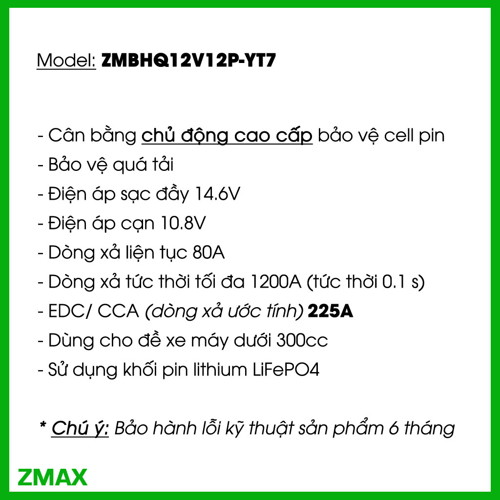 Bình Ắc quy pin lithium LiFePO4 ZMBHQ12V12P-YT7 là lựa chọn tối ưu cho những ai cần một nguồn năng lượng mạnh mẽ, bền bỉ và an toàn. Với tuổi thọ dài, hiệu suất cao và trọng lượng nhẹ, sản phẩm xứng đáng là giải pháp thay thế hoàn hảo cho ắc quy truyền thống.