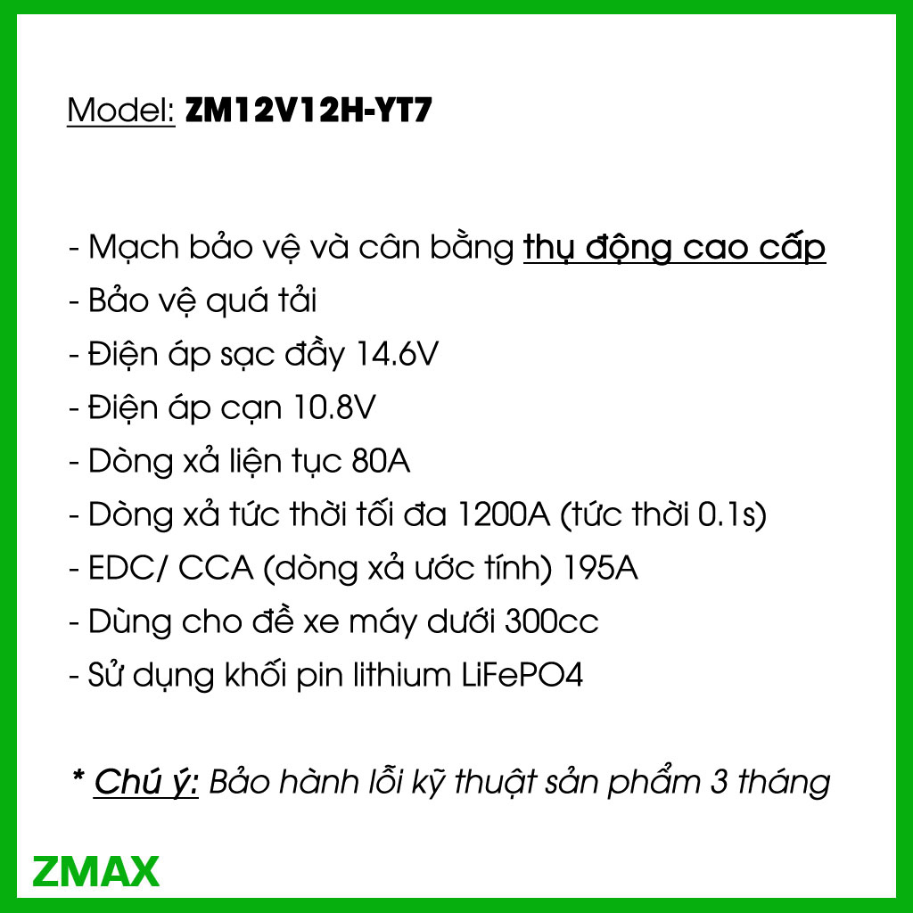 Bình Ắc quy pin lithium LiFePO4 ZM12V12H-YT7 là lựa chọn tối ưu cho những ai cần một nguồn năng lượng mạnh mẽ, bền bỉ và an toàn. Với tuổi thọ dài, hiệu suất cao và trọng lượng nhẹ, sản phẩm xứng đáng là giải pháp thay thế hoàn hảo cho ắc quy truyền thống.