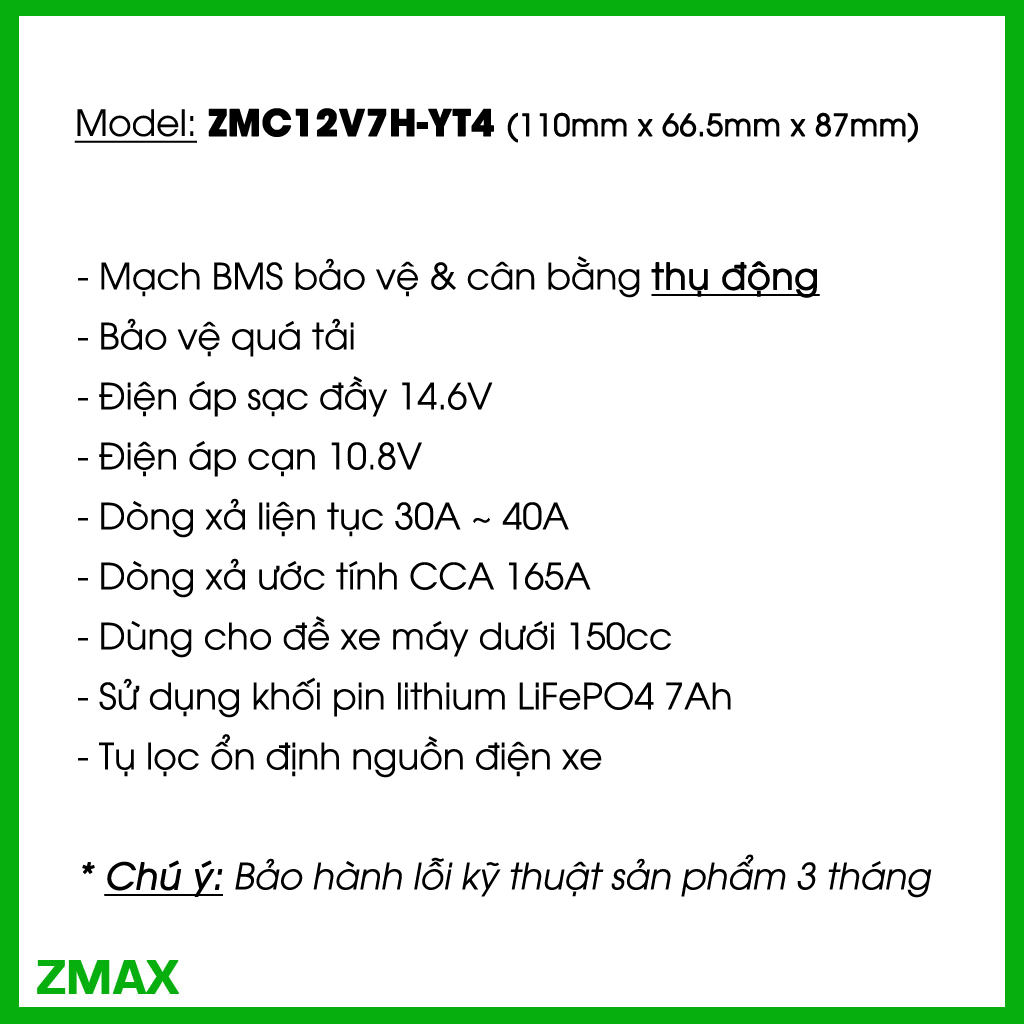 Bình Acquy Pin LFP (LiFePO4) 12V 7Ah – ZMC12V7H-YT4 | Giải pháp năng lượng tối ưu cho xe máy, mô tô 150cc