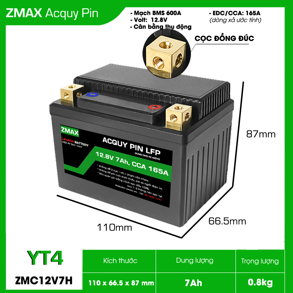Trong bối cảnh nhu cầu sử dụng xe máy và mô tô ngày càng cao, việc lựa chọn một loại bình acquy bền bỉ, an toàn và hiệu suất ổn định là yếu tố cực kỳ quan trọng. Bình Acquy Pin LFP (LiFePO4) 12V 7Ah – ZMC12V7H-YT4 chính là lựa chọn hiện đại, thay thế hoàn hảo cho các dòng acquy chì truyền thống.
