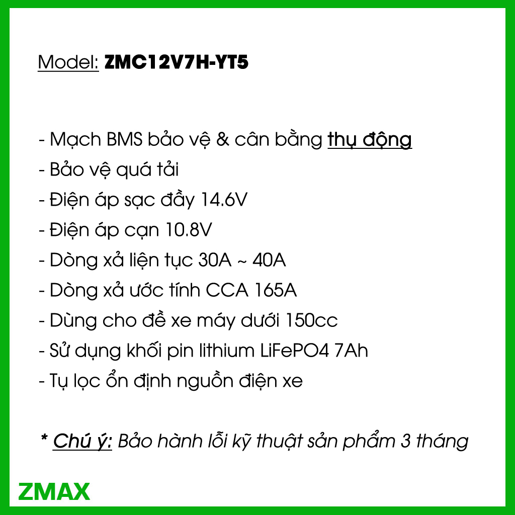 Bình ZMAX ZMC12V7H-YT5 cho hiệu suất tốt với các dòng xe phun xăng điện tử (Electronic Fuel Injection – EFI / Fi), xe có Idling Stop System (ISS) – chức năng tự động tắt động cơ khi dừng để tiết kiệm nhiên liệu) và xe có hệ thống đánh lửa IC/TCI (Transistor Controlled Ignition).