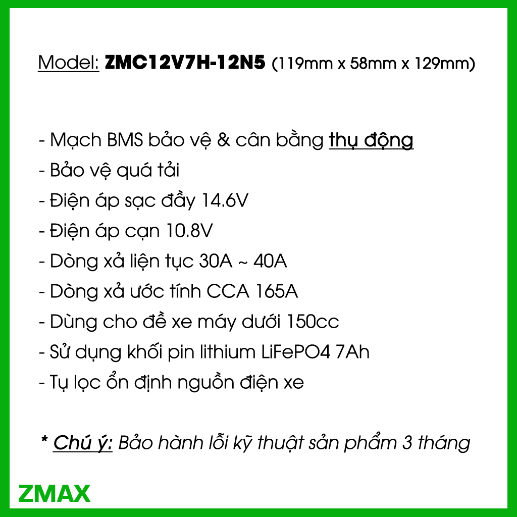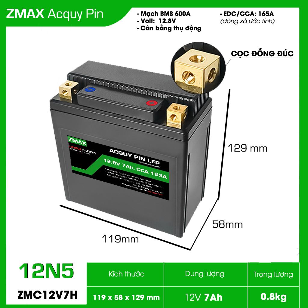 Nếu bạn đang tìm kiếm một loại bình acquy có hiệu suất cao, độ bền vượt trội và an toàn hơn so với acquy chì truyền thống, thì Bình Acquy Pin LFP (LiFePO4) 12V 7Ah – ZMC12V7H-12N5 chính là lựa chọn đáng cân nhắc. Đây là dòng sản phẩm ứng dụng công nghệ pin hiện đại, mang lại trải nghiệm vận hành ổn định và lâu dài cho xe máy, mô tô 150cc.
