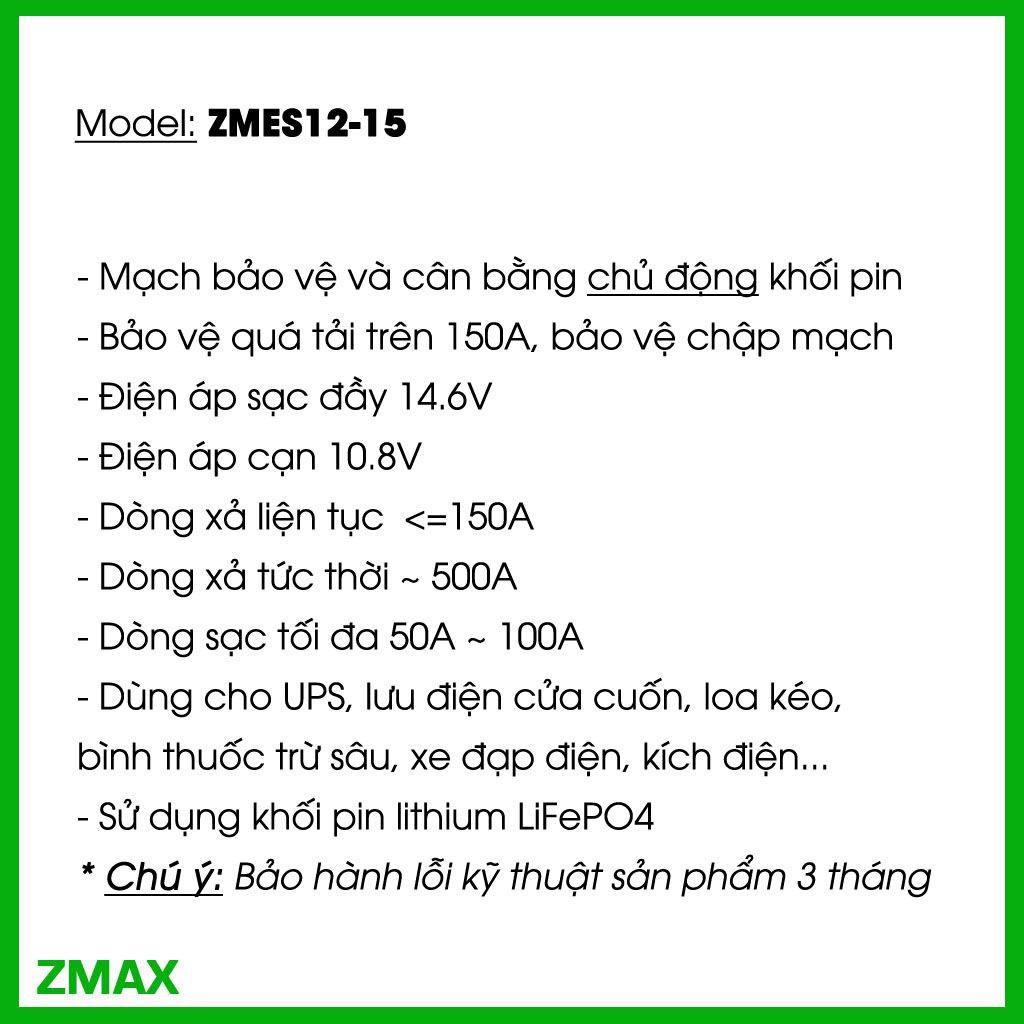 ZMES12-15 là dòng pin lithium LiFePO₄ cao cấp, dung lượng 15Ah, điện áp 12V, được thiết kế chuyên dụng cho các hệ thống bộ lưu điện UPS, thiết bị điện công suất cao, xe điện, năng lượng mặt trời, và nhiều ứng dụng đòi hỏi hiệu suất xả mạnh mẽ, ổn định và an toàn.